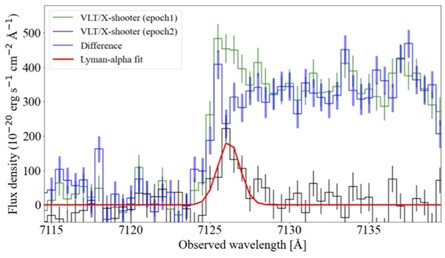 Grâce à un second spectre obtenu avec l’instrument VLT/X-shooter le 31 mars 2024 – soit 16,5 jours après le sursaut – il a été possible de confirmer la présence de l’émission Lyman-α, déjà détectée (mais contaminée par la contrepartie optique du FXT) lors de la première observation. À cette époque, la rémanence s’était considérablement estompée, ce qui a permis de révéler clairement la raie Lyα en émission, émise par la galaxie hôte. Cette détection permet d’estimer une limite inférieure du taux de formation stellaire dans la galaxie hôte, supérieure à 0,43 masses solaires par an.