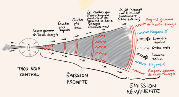 - Et la production d’émissions à haute énergie par le jet à grande distance (émission prompte et rémanente)