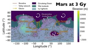 Les chercheurs ont en effet réalisé de nouvelles simulations en intégrant deux nouveaux ingrédients qui se sont révélés essentiels : la circulation océanique et l’évolution des glaciers. En ajoutant ces deux processus, leur étude révèle que la présence dans l’hémisphère Nord d’un océan circumpolaire peut être envisagée il y a trois milliards d’années, même pour des températures moyennes de Mars inférieures au point de congélation (0°C pour de l’eau pure), en raison de la circulation océanique qui a pu réchauffer localement la surface jusqu’à 4,5°C. Les simulations prédisent la présence de glaciers qui ramènent la glace des hauts plateaux vers l’océan, en accord avec les interprétations géologiques des images. Le climat était vraisemblablement froid sur les continents équatoriaux mais l’océan circumpolaire a pu rester liquide, en accord avec un certain nombre d’indices géologiques comme les paléo-rivages ou les dépôts de méga-tsunamis qui indiquent indirectement la présence d’un océan.