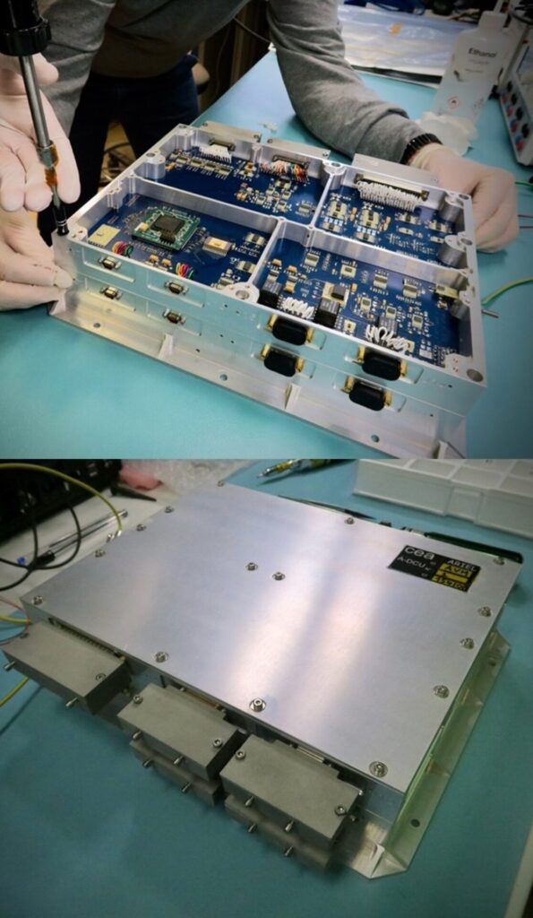 L’instrument AIRS AVM est composé du boitier électronique ADCU (AIRS Detector Control Unit) associé à des simulateurs reproduisant le fonctionnement électrique des plans focaux intégrés. Il est constitué principalement de deux cartes similaires qui permet le pilotage et l’acquisition simultanée des 2 voies du spectromètres CH0 et CH1, afin de couvrir les longueurs d’ondes de 1.95 à 7.8 microns. Assurant l’interface avec le boitier de contrôle de l’instrument, il doit garantir, avec le plan focal détecteur, les performances scientifiques de toute la chaine de détection de l’instrument.